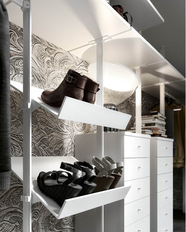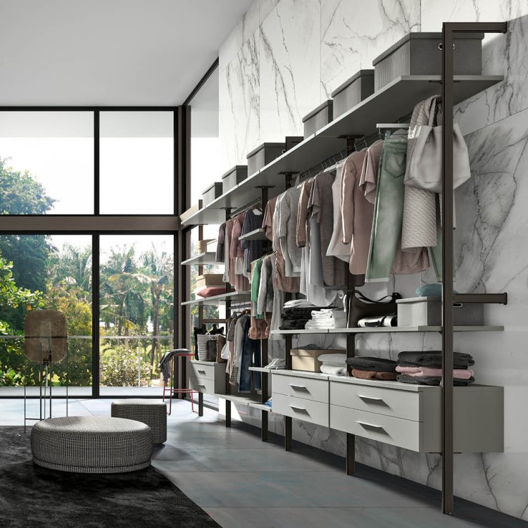 Le cabine armadio System Metal hanno un’estetica più industriale ed essenziale grazie ai montanti in metallo titanio o bianchi. Molteplici soluzioni con moltissime possibilità di personalizzazione e una ricca gamma di accessori. Queste caratteristiche permettono di giocare con la fantasia e di creare cabine armadio originali che si adattano perfettamente allo stile e allo spazio del proprio guardaroba, possono essere fissate da pavimento a soffitto o da pavimento a parete.