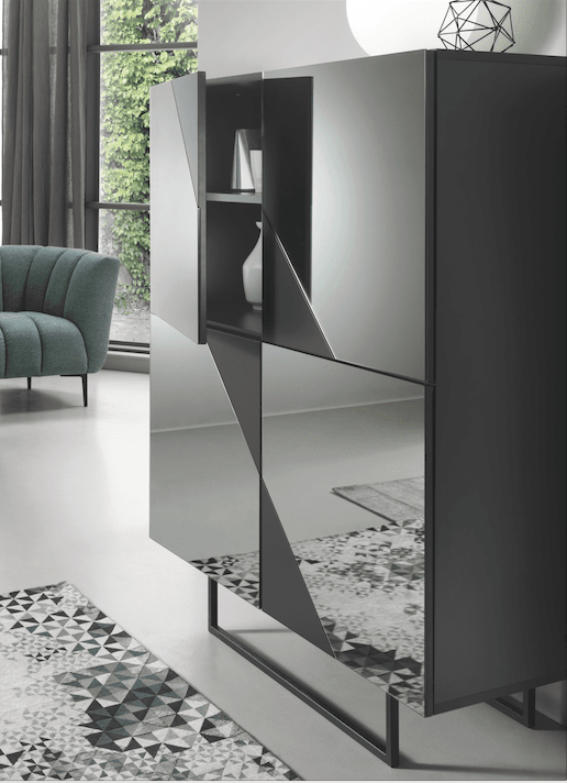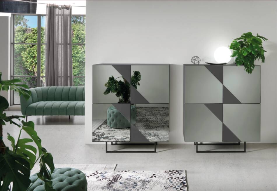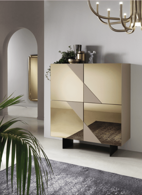 Credenza con scocca in nobilitato ed ante in MDF rivestita in vetro specchio.