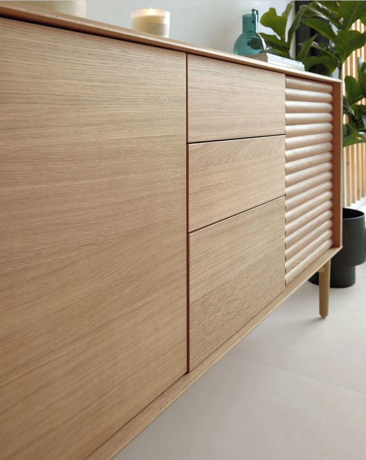 La qualità di Lenon è presente in ogni centimetro di questo mobile. Fatto in legno massello e impiallacciatura in rovere e fabbricato in Europa, ha un design unico che viene espresso da tutte le sue parti, come ad esempio i bordi arrotondati o il rilievo dei cassetti.