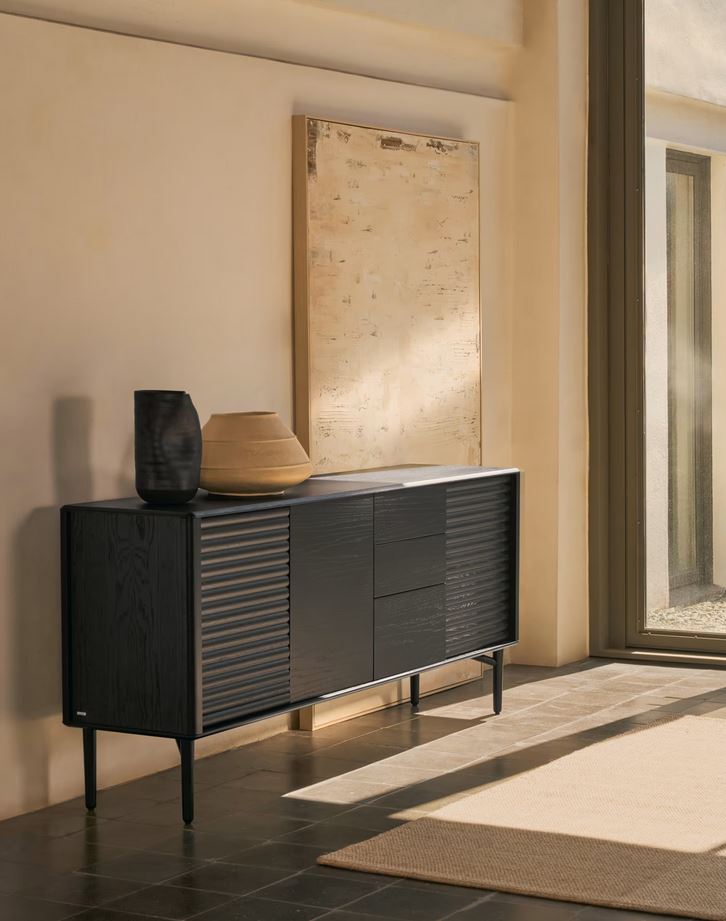 - Credenza in legno massello e impiallacciatura in rovere con finitura verniciata in nero.