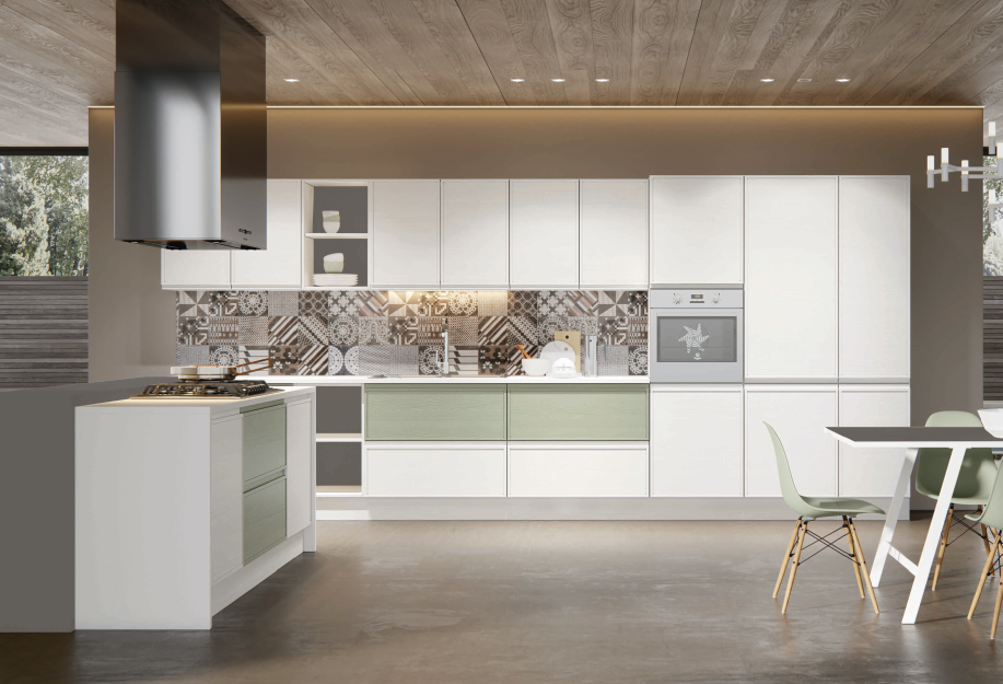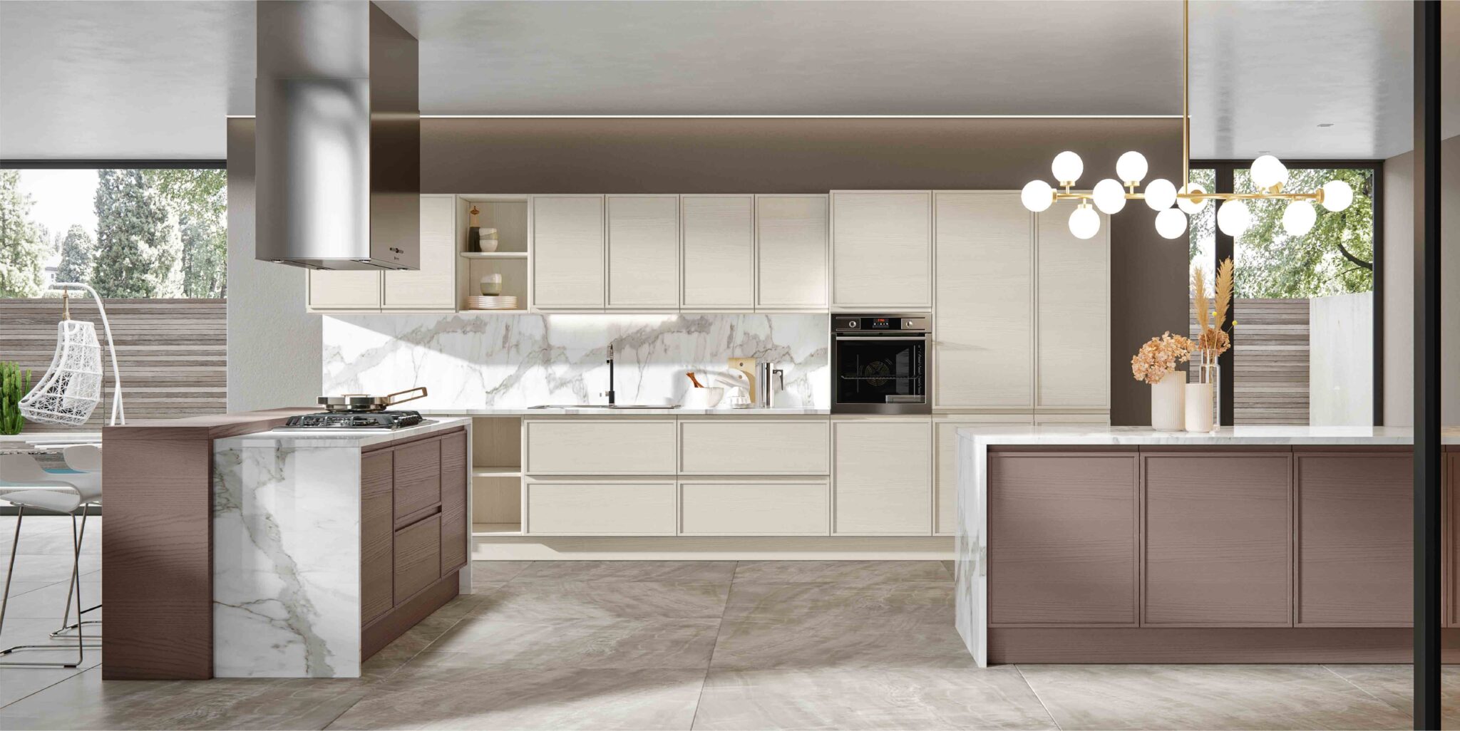 La linea Bellagio è il connubio perfetto tra artigianalità e contemporaneità. Una composizione caratterizzata dalle ante a telaio e le aperture a gola.