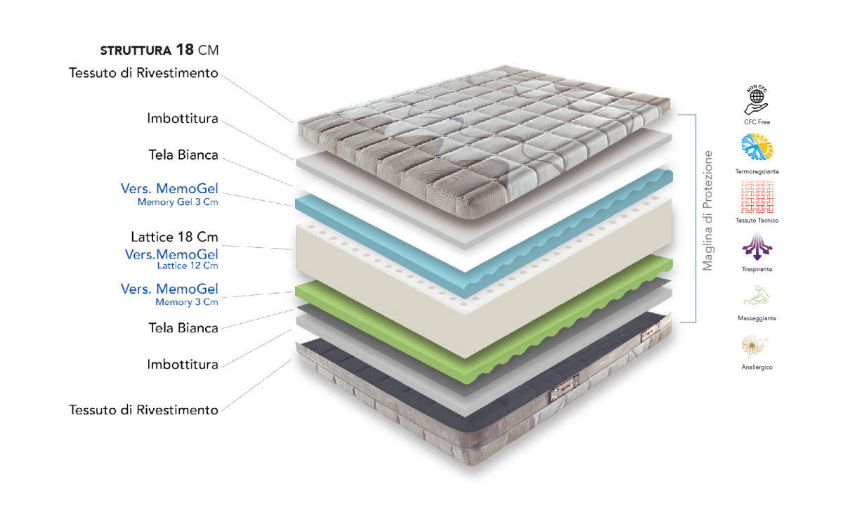 Struttura in schiuma di lattice a densità differenziata, consente un’ottima ergonomia ed un supporto ideale per accogliere il vostro corpo in modo corretto e confortevole per un elevato senso di benessere.